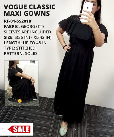 Package Contains :- Dress Material :- Georgette Size :- S :- 36, M :- 38, L :- 40. XL :- 42 Sleeves Type :- Sleeveless Pattern :- Plain Color :- Black