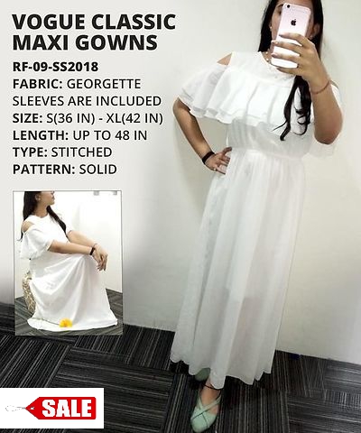 Package Contains :- Dress Material :- Georgette Size :- S :- 36, M :- 38, L :- 40. XL :- 42 Sleeves Type :- Sleeveless Pattern :- Plain Color :- White