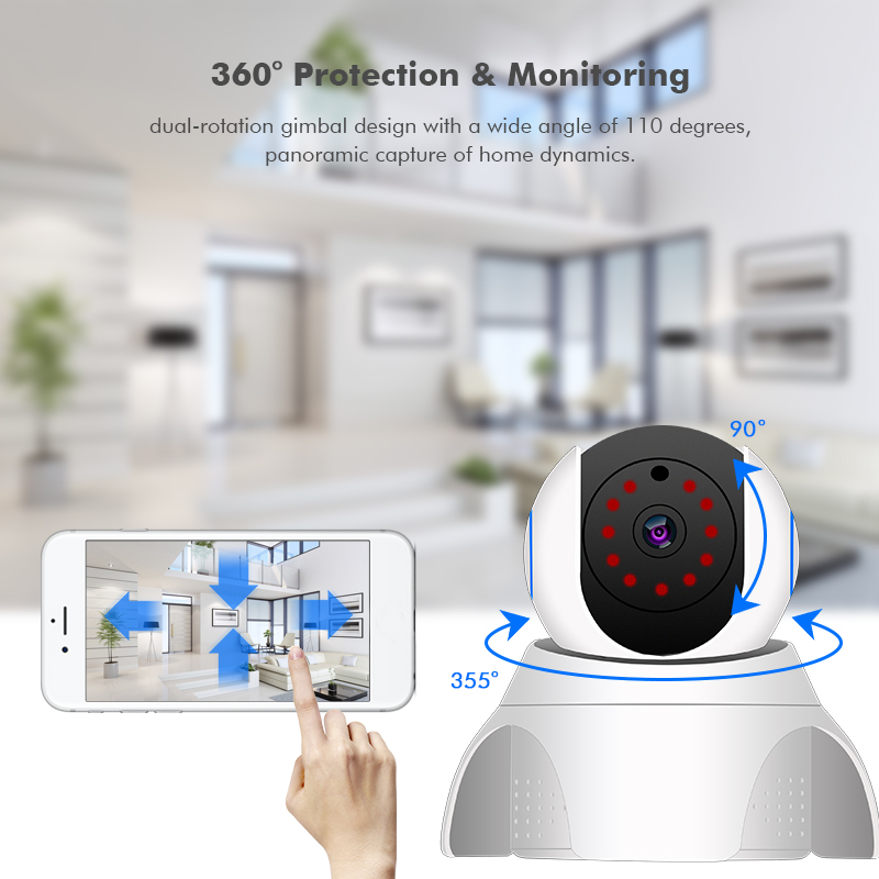 ►360 Degree Protection & Monitoring – dual-rotation gimbal design, support 355° horizontal and 90° Vertical Flexible rotation with a wide angle of 110 degrees, panoramic capture of home dynamics.