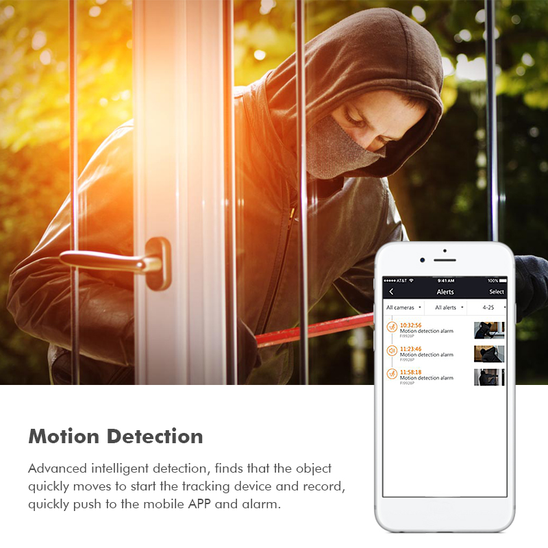 ►M otion Detection – Advanced intelligent detection, finds that the object quickly moves to start the tracking device and record, quickly push to the mobile APP, and the second speed alarm.